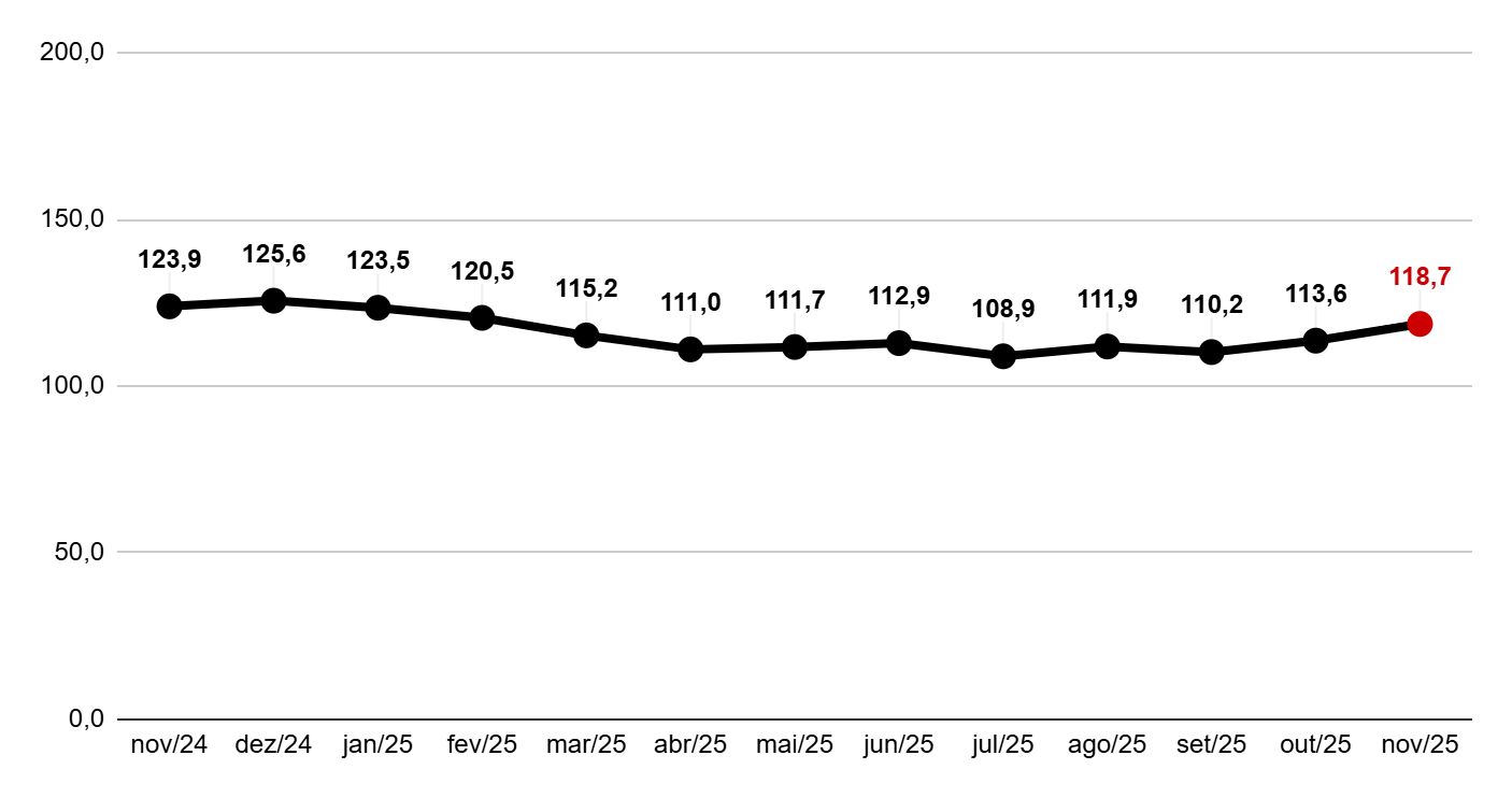 E o Índice de Expectativas do Consumidor (IEC), também registrou alta de 4,6% em novembro, atingindo 121,8 pontos. Mesmo com o avanço mensal, no comparativo interanual houve queda de 5,9%, sinalizando uma revisão das projeções de médio prazo. O descompasso entre a melhora de curto prazo e a fragilidade estrutural resulta em um consumidor mais seletivo, prudente e focado em necessidades imediatas.