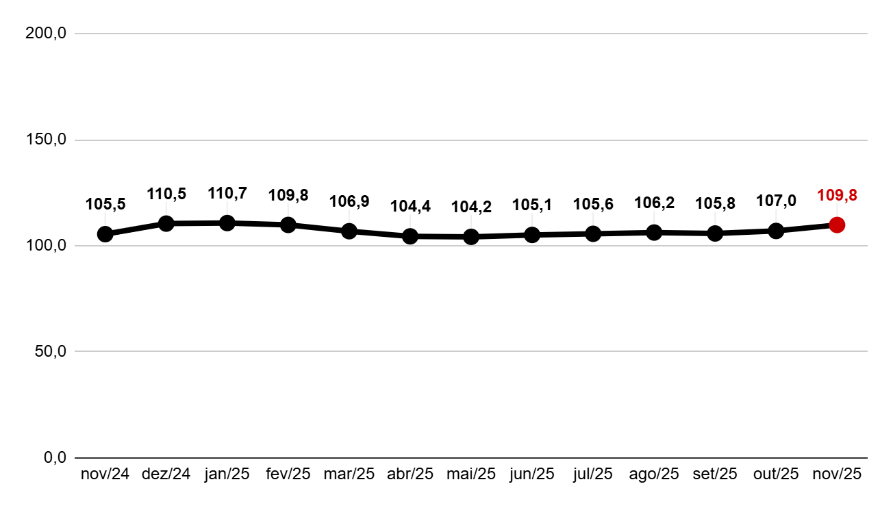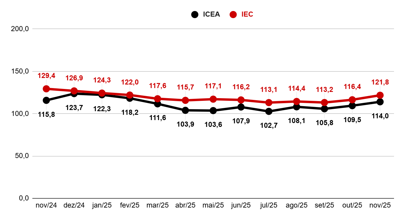 Dentre os indicadores do ICC, o Índice de Confiança Econômica das Famílias (ICEA) avançou 4,2% em novembro e alcançou 114 pontos, sinalizando uma percepção mais favorável sobre o momento presente. A injeção do 13º salário também contribuiu para ampliar a liquidez das famílias, favorecendo tanto o consumo imediato quanto a quitação de dívidas. Apesar do avanço mensal, o índice registra queda anual de 1,5%, refletindo o alto nível de endividamento.