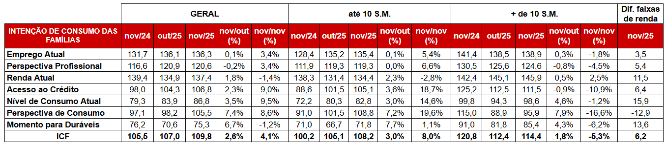 Na análise por faixa de renda, para as famílias com até 10 salários-mínimos a alta foi de 3% no mês registrando 108,2 pontos — no comparativo anual, o crescimento foi de 5,1% — que demonstra resiliência relativa, favorecido por ganho marginal de renda real e pelo efeito do 13º salário. Porém, o endividamento elevado e o crédito caro continuam limitando uma recuperação mais firme.