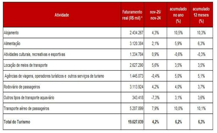 Só em novembro, último mês analisado pela pesquisa, o Turismo faturou R$ 19,6 bilhões, alta de 4,2% em comparação com o mesmo período de 2024. O transporte aéreo foi o segmento que mais contribuiu para o resultado, com crescimento de 7,9% e faturamento de R$ 5,2 bilhões.