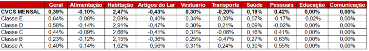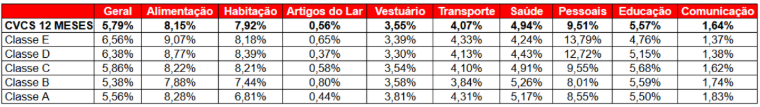 Com a distribuição de despesas mais concentrada em grupos de alta representatividade, as classes de menor poder aquisitivo foram as mais afetadas: 6,56% para a classe E e 6,38% para a classe D. Já para as classes mais abastadas, as variações foram de 5,38% para a classe B e de 5,56% para a classe A.