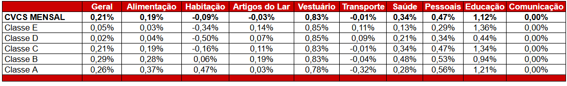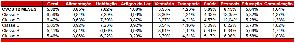 No acumulado de 12 meses, o custo de vida foi mais elevado para as classes de menor poder aquisitivo, com altas de 6,56%, na classe E, e 6,47%, na classe D. Entre as classes mais altas, as variações ficaram em 5,41%, para a classe B, e 5,46%, para a classe A. Essa diferença ocorre porque, nas famílias de menor renda, os gastos se concentram nos grupos de despesas que têm maior peso no orçamento [tabela 2].