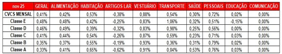 O Custo de Vida por Classe Social (CVCS) na Região Metropolitana de São Paulo (RMSP) encerrou o ano em aceleração. Em novembro, o índice registrou variação de 0,41% e acumulou alta de 5,03% em 12 meses. A classe E apresentou a maior variação de preços no período, com avanço de 0,48%. Na sequência, ficaram as classes B e A, com altas de 0,35% e 0,33%, respectivamente.