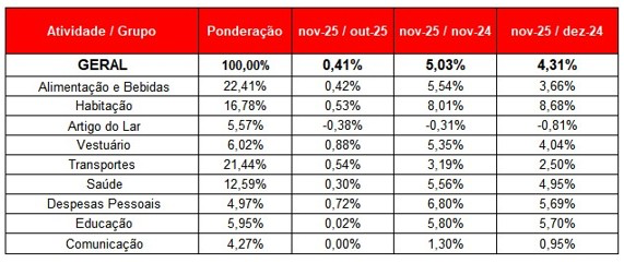 Já o Índice de Preços dos Serviços (IPS) apontou avanço de 0,36%, registrando uma alta acumulada em 2025 de 5,97%. Nos últimos 12 meses, o IPS variou 6,22%. Dentre os oito grupos que compõem o indicador, nenhum encerrou mês com decréscimo, mas a maior contribuição para o resultado veio da habitação (0,45%).