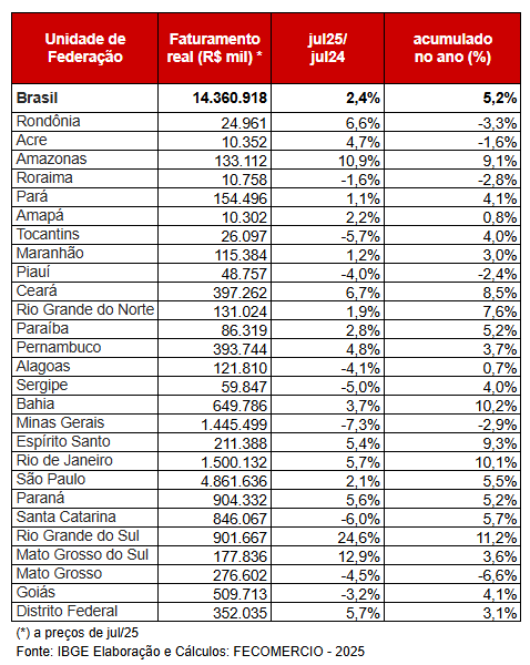 São Paulo, maior mercado em faturamento absoluto, movimentou R$ 4,86 bilhões no período — um crescimento de 2,1% frente ao mesmo mês de 2024. Já no campo negativo, Minas Gerais sofreu retração de 7,3%, seguido por Santa Catarina (-6%) e Tocantins (-5,7%).