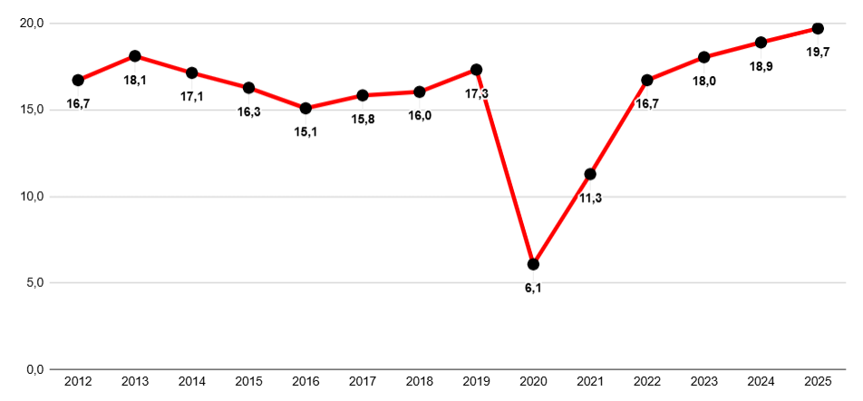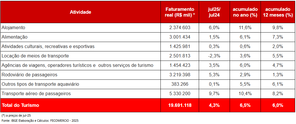 Como alternativa ao preço das passagens aéreas, o transporte rodoviário registrou expansão em julho, com alta de 5,3% em comparação com o mesmo mês do ano anterior e receita de R$ 3,2 bilhões. No mesmo período, as agências e operadoras de turismo cresceram 3,5%, movimentando R$ 1,5 bilhão — resultado que reforça a relevância do canal de intermediação para os consumidores que buscam segurança e praticidade nas viagens.