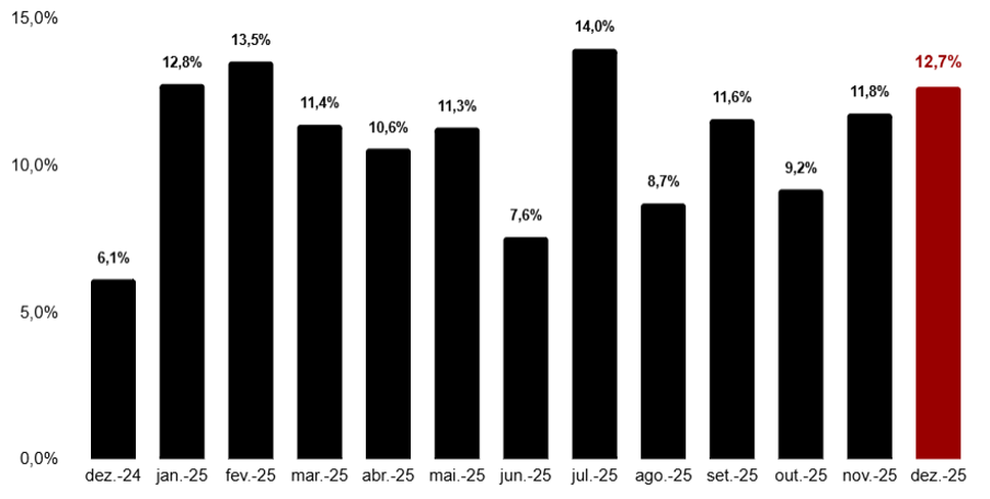 Sendo assim, é possível observar que o desempenho dos Serviços ao longo de 2025 foi marcado pelo crescimento relativamente disseminado entre as atividades, mesmo que em ritmos distintos, em que os serviços técnicos e profissionais, além dos intensivos em conhecimento técnico, se destacaram. Entretanto, juros elevados já influenciam o resultado de alguns segmentos — como a construção civil, que recuou 2,4%, enquanto o faturamento da atividade de representação caiu 6,3%.