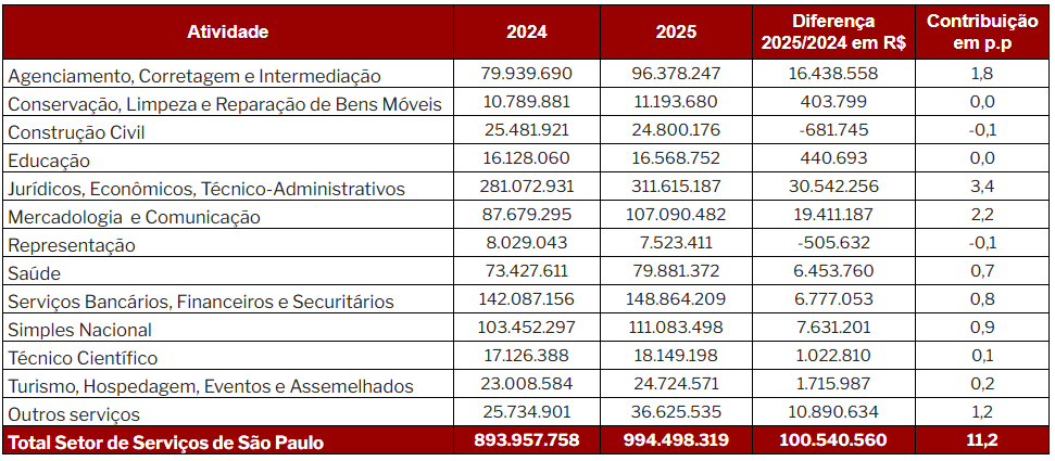 O ano passado terminou com o maior faturamento histórico desde 2010 no setor de Serviços na capital paulista. Segundo os dados da Pesquisa Conjuntural do Setor de Serviços (PCSS), elaborada pela Federação do Comércio de Bens, Serviços e Turismo do Estado de São Paulo (FecomercioSP) com base nas informações da Secretaria da Fazenda do Município de São Paulo (Sefaz/SP), a alta foi de 11,2% em comparação com 2024, registrando faturamento de R$ 994,5 bilhões [tabela 1].