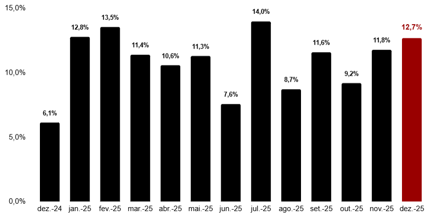Em dezembro passado, o faturamento real do setor na capital paulista atingiu R$ 100,3 bilhões, alta de 12,7% em relação ao mesmo mês do ano anterior, visto que é o maior faturamento mensal desde o início da série histórica — iniciada em janeiro de 2010. Em termos absolutos, significa um crescimento de quase R$ 11,3 bilhões nas receitas em comparação com dezembro de 2024 [gráfico 1].