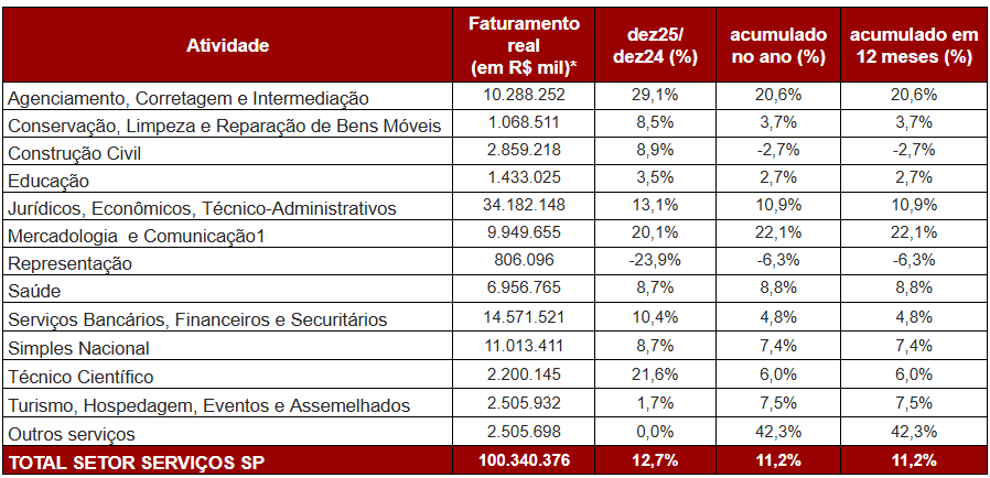 Sendo assim, é possível observar que o desempenho dos Serviços ao longo de 2025 foi marcado pelo crescimento relativamente disseminado entre as atividades, mesmo que em ritmos distintos, em que os serviços técnicos e profissionais, além dos intensivos em conhecimento técnico, se destacaram. Entretanto, juros elevados já influenciam o resultado de alguns segmentos — como a construção civil, que recuou 2,4%, enquanto o faturamento da atividade de representação caiu 6,3%.