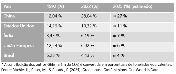 Evolução e estimativa de 2025 de participação porcentual nas Emissões Globais de GEE:*