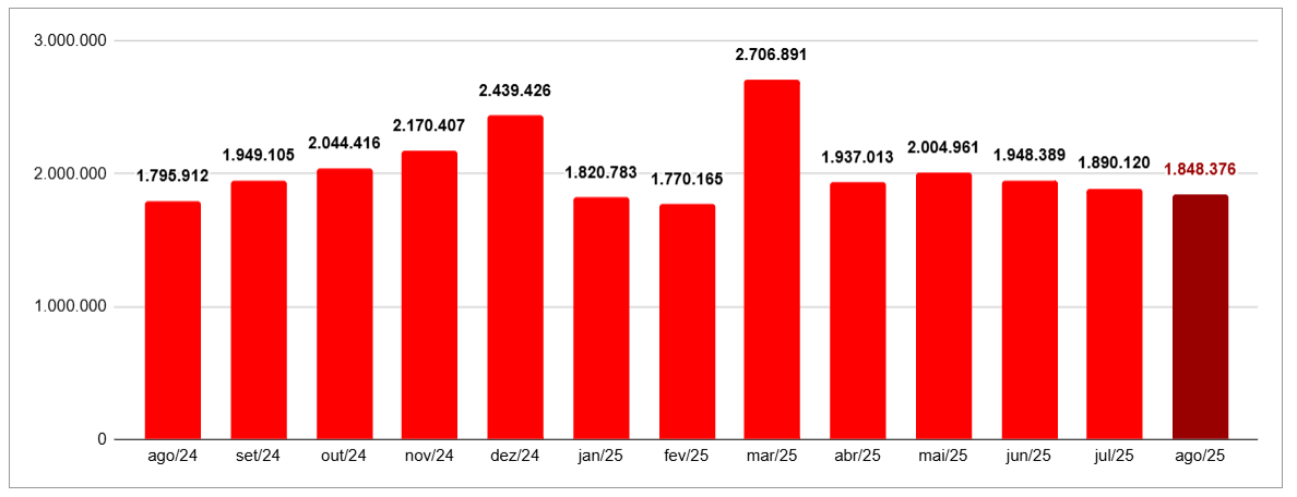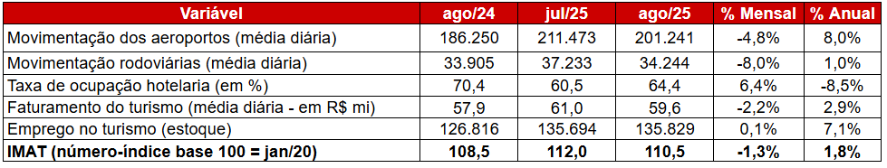 A movimentação dos aeroportos cresceu 8%, com a média diária de 201,2 mil passageiros, já a movimentação rodoviária cresceu 1% com 34,2 mil embarques e desembarques por dia em agosto.