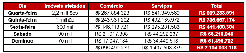 Serviços foram mais prejudicados, com baixas estimadas em R$ 1,4 bilhão; comércio, por sua vez, deixou de faturar quase R$ 700 milhões