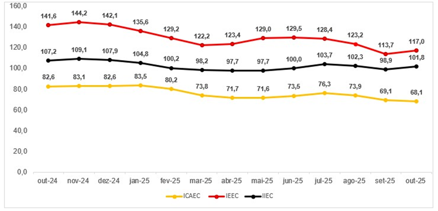 O ICEC é composto por três variáveis. O Índice das Condições Atuais do Empresário do Comércio (ICAEC) recuou 1,5%, passando de 69,1 pontos, em setembro, para 68,1 pontos, em outubro — o menor patamar desde julho de 2021, sendo o item de pior avaliação entre os componentes do ICEC e se mantendo abaixo dos 100 pontos pelo 32º mês consecutivo. Além disso, o ICAEC exibiu queda de 17,6% em relação a outubro do ano passado.
