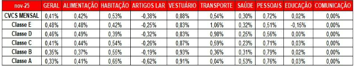 O Custo de Vida por Classe Social (CVCS) na Região Metropolitana de São Paulo (RMSP) encerrou o ano em aceleração. Em novembro, o índice registrou variação de 0,41% e acumulou alta de 5,03% em 12 meses. A classe E apresentou a maior variação de preços no período, com avanço de 0,48%. Na sequência, ficaram as classes B e A, com altas de 0,35% e 0,33%, respectivamente.