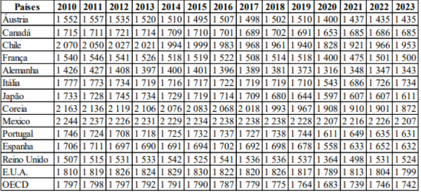 Jornada anual de trabalho dos países da OCDE (2010–2023)