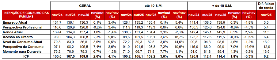 Na análise por faixa de renda, para as famílias com até dez salários mínimos, a alta foi de 3% no mês, registrando 108,2 pontos — no comparativo anual, o crescimento foi de 8% —, apontando resiliência relativa, favorecida por ganho marginal de renda real e pelo efeito do décimo terceiro salário. Contudo, o endividamento elevado e o crédito caro continuam limitando uma recuperação mais firme.