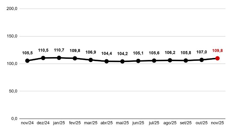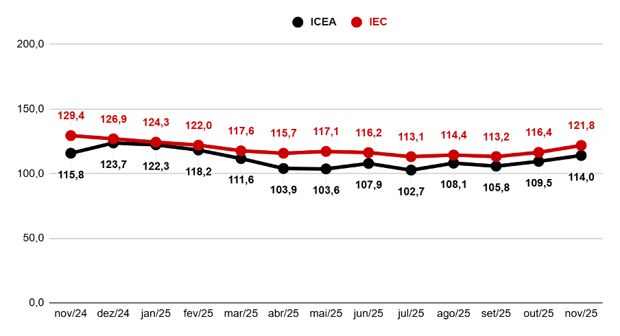 Dentre os indicadores do ICC, o Índice de Confiança Econômica das Famílias (ICEA) avançou 4,2% em novembro e alcançou 114 pontos, sinalizando uma percepção mais favorável sobre o momento presente. A injeção do décimo terceiro também contribuiu para ampliar a liquidez dos lares, favorecendo tanto o consumo imediato quanto a quitação de dívidas. Apesar do avanço mensal, o índice registrou queda anual de 1,5%, refletindo o alto nível de endividamento.