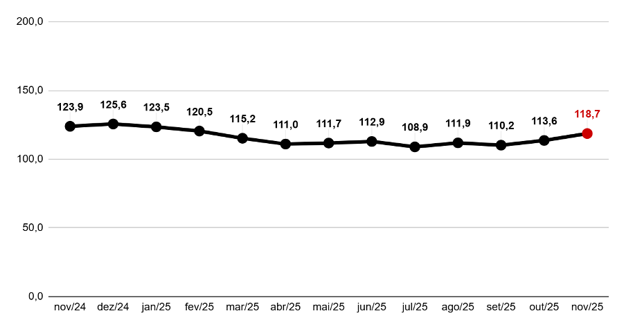 O Índice de Expectativas do Consumidor (IEC), por sua vez, também registrou alta (4,6%) em novembro, atingindo 121,8 pontos. Mesmo com o avanço mensal, no comparativo interanual houve queda de 5,9%, sinalizando uma revisão das projeções de médio prazo. O descompasso entre a melhoria de curto prazo e a fragilidade estrutural resulta em um consumidor mais seletivo, prudente e focado em necessidades imediatas.
