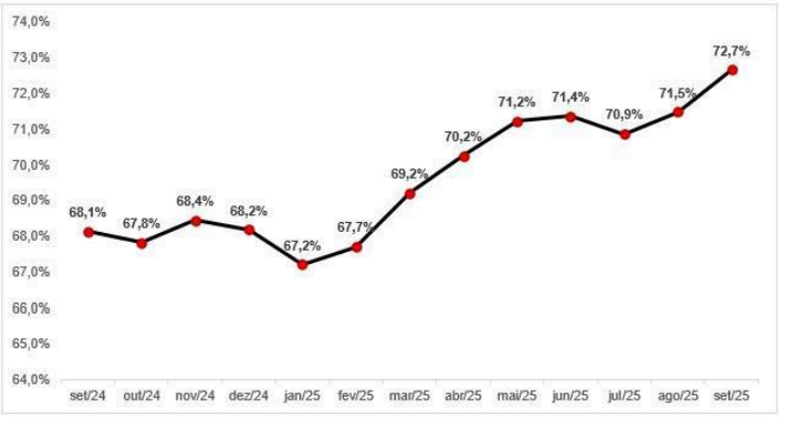 O endividamento atingiu 72,7% das famílias paulistanas em setembro — chegando ao maior nível desde junho de 2023, quando alcançava 72,8% dos lares. Os dados da Pesquisa de Endividamento e Inadimplência do Consumidor (PEIC), da Federação do Comércio de Bens, Serviços e Turismo do Estado de São Paulo (FecomercioSP), apontam um avanço em comparação com agosto, quando esse porcentual era de 71,5%.
