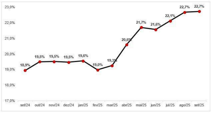 Enquanto o endividamento avançou, a inadimplência se manteve estável. Atualmente, 22,7% dos lares têm dívidas atrasadas, mesmo porcentual de agosto — embora acima do registrado em setembro de 2023, quando esse número era de 18,9%. São 931,6 mil famílias com contas em atraso, um crescimento de 160 mil em um ano.