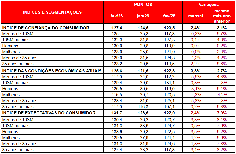 Em sentido oposto, o Índice das Condições Econômicas Atuais (ICEA) recuou 3,7% frente a janeiro, e registrou 121 pontos. A retração foi disseminada entre a maior parte dos grupos analisados, com exceção de consumidores com renda superior a dez salários-mínimos e pessoas com 35 anos ou mais, que apresentaram leve avanço. Apesar do recuo no mês, o indicador permanece acima do observado há um ano, com crescimento interanual de 2,3%, demonstrando que a avaliação sobre a situação econômica atual segue mais positiva do que no ano passado.