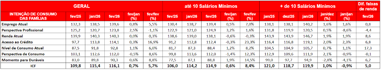 A comparação entre as faixas de renda indica uma retomada heterogênea do consumo. Em fevereiro, o ICF dos consumidores de maior renda superou o da faixa de até 10 salários mínimos em 5 pontos. A maior diferença aparece no nível de consumo atual, com vantagem de 17,3 pontos para a renda mais alta, evidenciando que o consumo corrente permanece significativamente mais forte entre as famílias com maior poder aquisitivo.