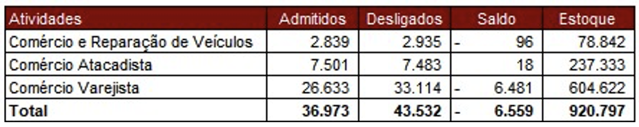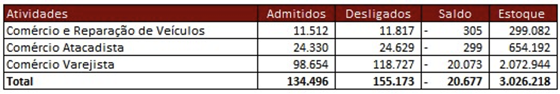 Dentre as divisões do setor de Comércio, o Varejista — o mais aquecido durante o período de maior demanda sazonal — foi o que mais contribuiu para o resultado negativo do mês, com a eliminação de 20.073 vagas. Na sequência, ficaram os segmentos de Comércio e Reparação de Veículos (-305) e o Atacadista (-299) [tabela 2].