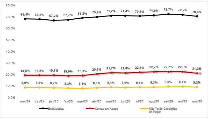 Entre aquelas que recebem até dez salários mínimos, o endividamento caiu de 75,8% para 74,6%. Já no grupo que ganha acima desse valor, houve recuo de 61,7% para 59%. Apesar da retração mensal, em ambos os casos os níveis seguem superiores aos registrados em novembro de 2024.